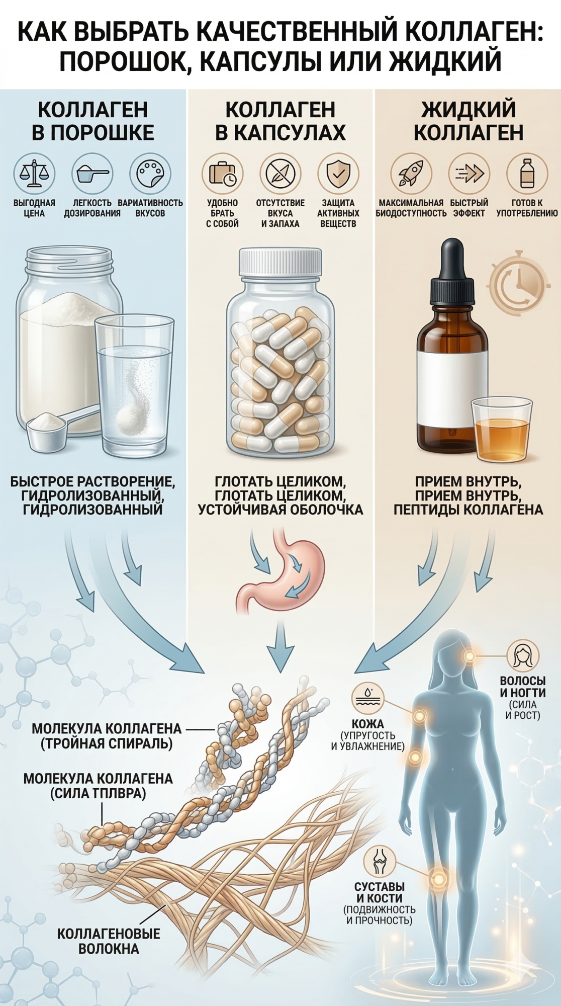 Во-вторых, выбирая коллаген порошок или капсулы, делайте однозначный выбор в пользу порошка. Только порошковая форма способна обеспечить организм необходимой суточной дозировкой в 15-17 граммов без создания излишней нагрузки на желудочно-кишечный тракт оболочками капсул и технологическими добавками. Жидкие формы следует исключить из-за высоких рисков бактериального осеменения, наличия консервантов и экономической нецелесообразности.