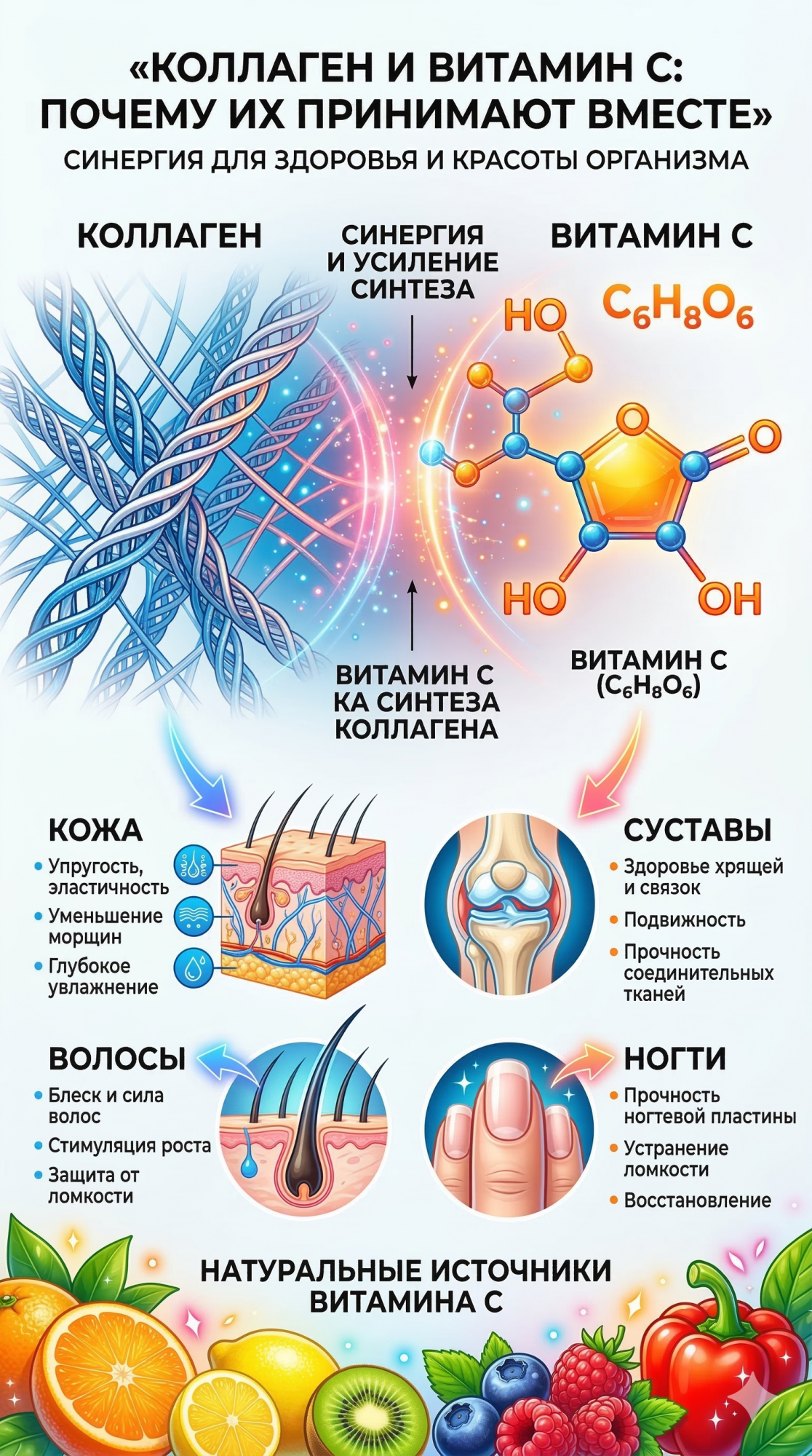 Введение в биологию соединительной тканиСтруктурная целостность человеческого организма во многом определяется состоянием внеклеточного матрикса, ключевым компонентом которого выступает коллагеновый белок. Будучи самым распространенным белком у млекопитающих, он формирует жесткий, но эластичный каркас для дермы, костной ткани, сухожилий, хрящей и кровеносных сосудов. Однако процесс формирования полноценного, функционально активного белкового волокна представляет собой сложный многоступенчатый процесс, который невозможен без участия специфических кофакторов. В современной нутрициологии коллаген и витамин с рассматриваются как неразрывный биохимический тандем, представляющий собой один из наиболее изученных и физиологически значимых механизмов поддержания молодости и здоровья тканей. Научные данные убедительно доказывают, что изолированное поступление аминокислот в организм без соответствующей антиоксидантной и ферментативной поддержки часто не приводит к желаемому терапевтическому эффекту, так как строительный материал не может быть правильно усвоен и встроен в поврежденные структуры.