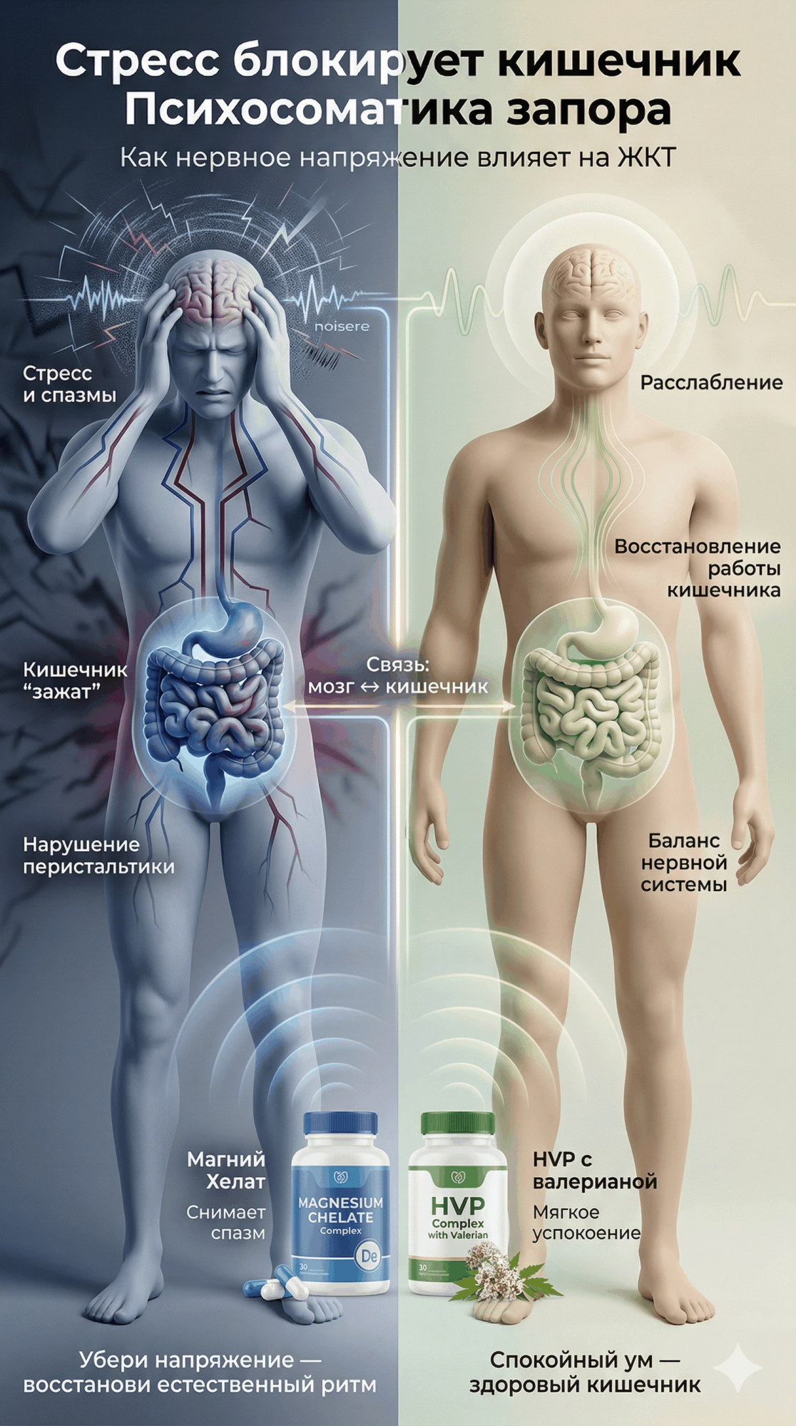 Понимание того, как работают блуждающий нерв и серотониновые рецепторы, открывает путь к физиологичной, бережной коррекции. Отказ от агрессивных стимулирующих слабительных в пользу метаболической и седативной поддержки является единственно верным стратегическим решением. Применение биодоступных комплексов от Nature's Sunshine — Магний Хелат для глубокого клеточного расслабления мышечных волокон и HVP для мягкой гармонизации центральной нервной системы — позволяет разорвать порочный круг боли и тревоги.