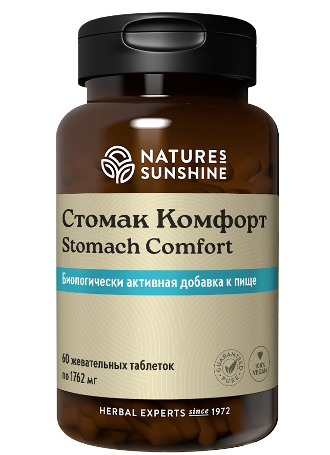 Стомак Комфорт НСП способствует нивелированию симптомов со стороны желудка, связанных с увеличением активности клеток, секретирующих соляную кислоту в просвет органа. Препарат не следует принимать людям, имеющим повышенное значение pH пищеварительного сока. В состав БАД Стомак Комфорт входит 5,8 мг танина, 0,55 мг глицирризиновой кислоты, 32 мг альгиновых кислот и 1,5 мг папаина. Данный препарат является дополнительным источником кальция, купить в Москве можно через наш сайт