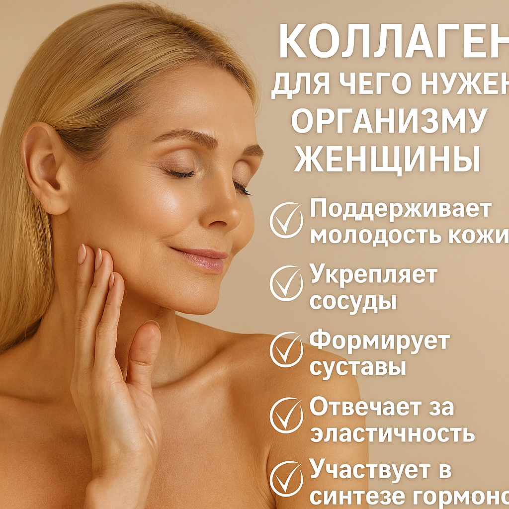 Коллаген для чего нужен организму женщины? Прежде всего — для сохранения упругости и молодости кожи. Он отвечает за её гладкость, увлажнённость и способность к регенерации.